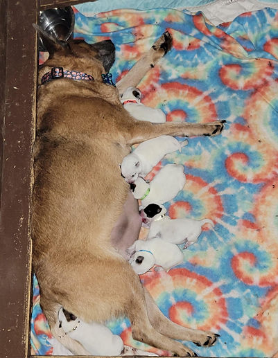 Our whelping Area is our Bedroom. Each puppy is hand whelped Cord Tied and Cut. Puppy is then weighed and Collared. Puppies are Kept in a warming box tell mom is done this way she is less like to step on one while still whelping. once the last puppy is born mom's whelping box is clean and fresh blankets are put in along with her babies